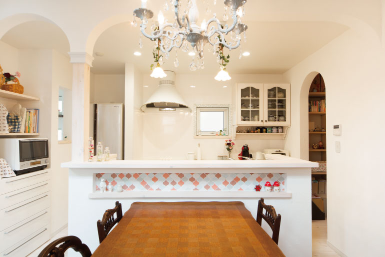 アールの下がり壁で優しい印象のキッチン。棚には可愛らしい雑貨が並んでいます。お子様がのびのびと過ごせるタタミコーナーなど見どころ満載です。