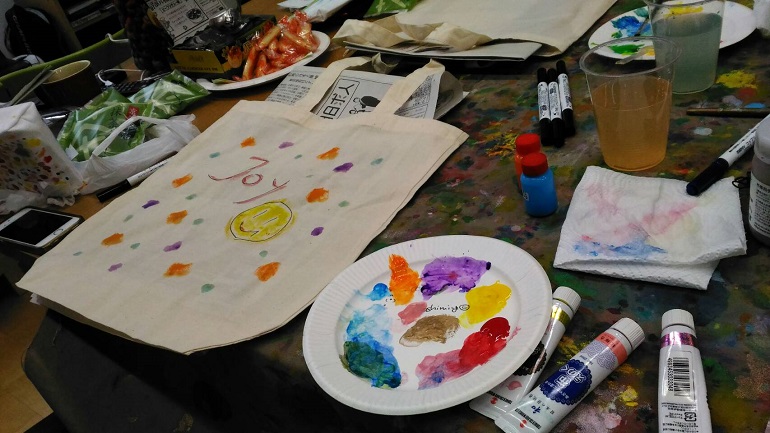 今回のイベントでは、エコバックに、好きな色を使って、自由に色をのせていきます。ペンで、絵を書いてから、色を塗ってもいいし、いきなり筆で色をのせていってもいいし・・・説明を聞きながら、どんな絵にしようかなと、皆さんしばらく思案中。